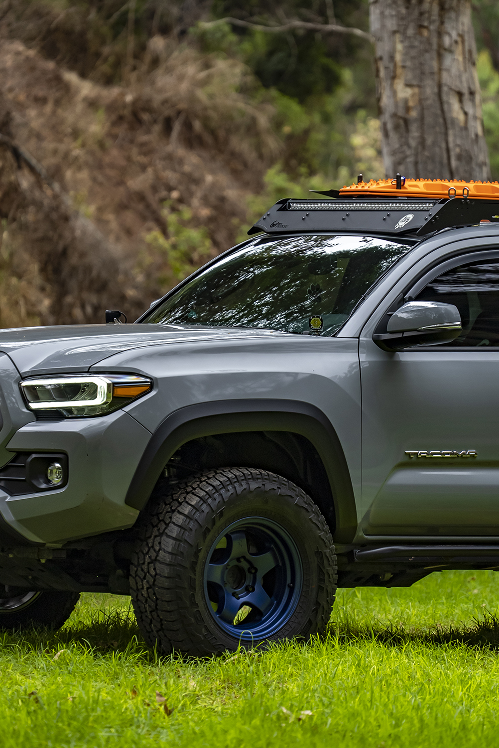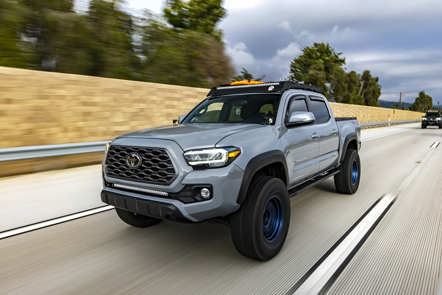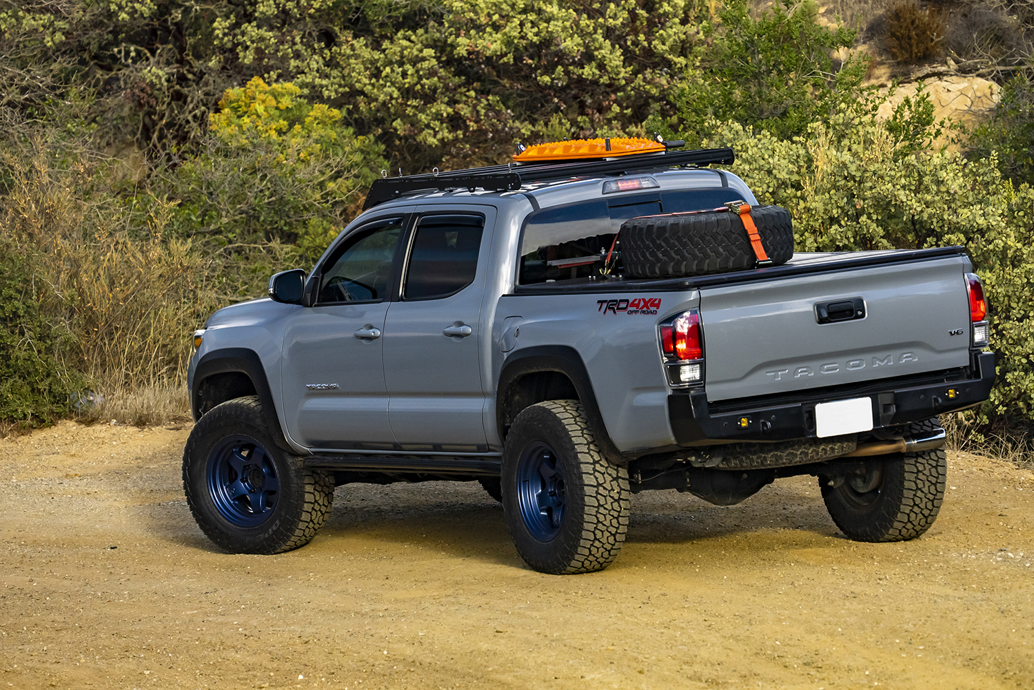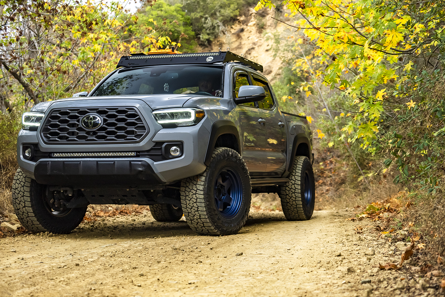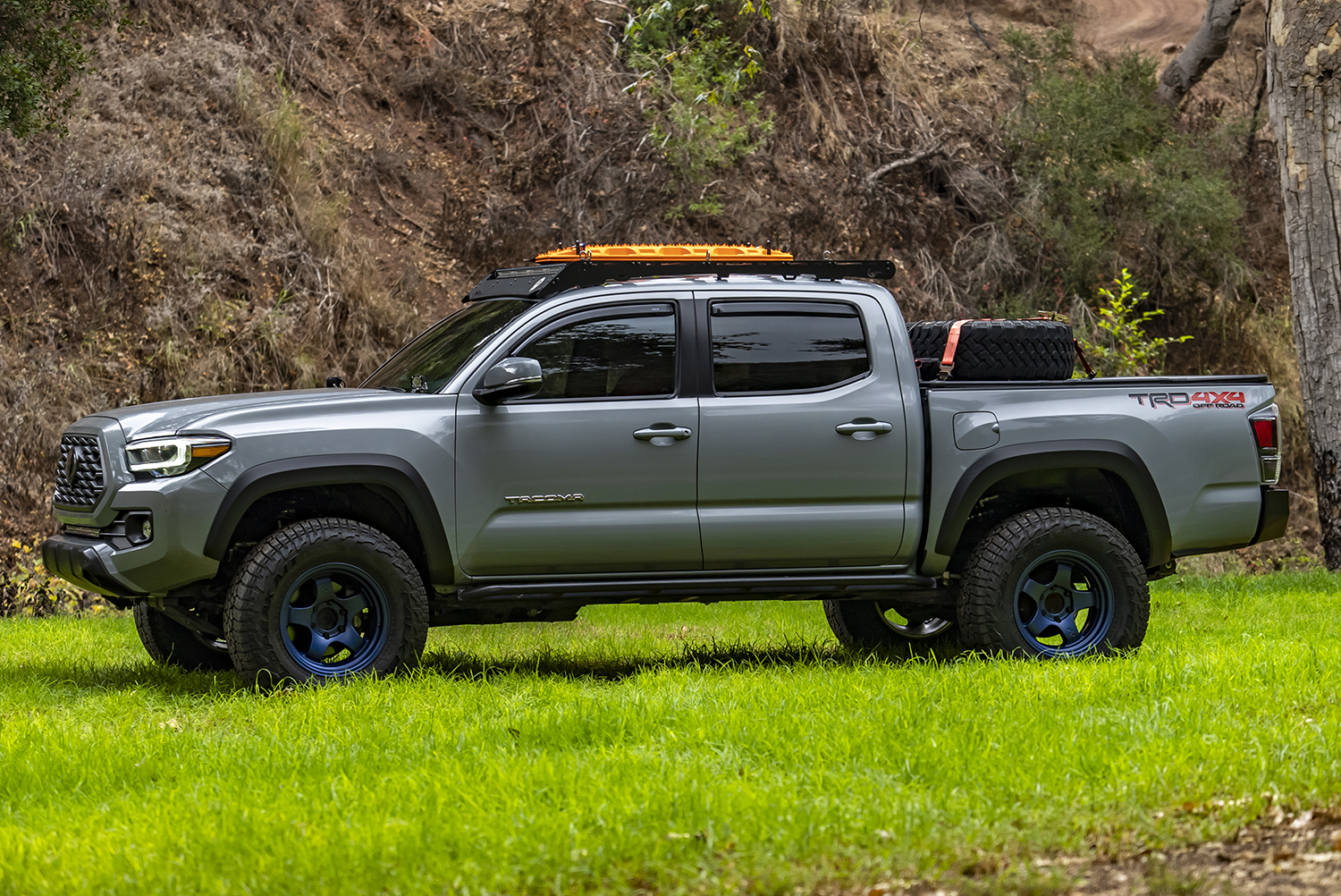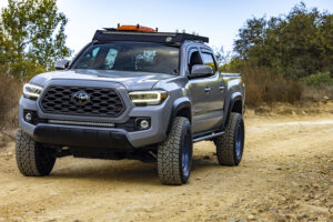 This 2020 Cement Grey Toyota Tacoma TRD 4×4 Off Road features a Prinsu roof rack, Fox Performance Elite 2.5 suspension, and Baja Designs lighting. Tires shown in photos are 33″ 285/70-17 Falken Wildpeak A/T and wheels are Circuit Offroad Hayford 17×8.5 6×139.7 et-10mm in Matte Bronze.