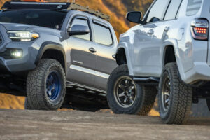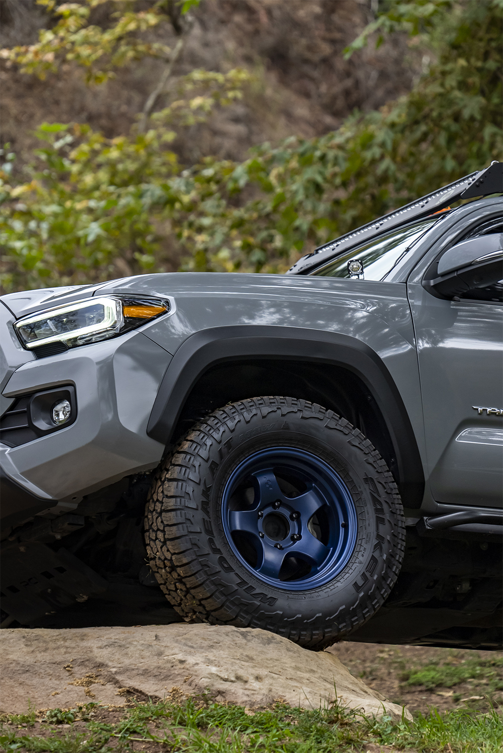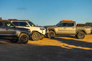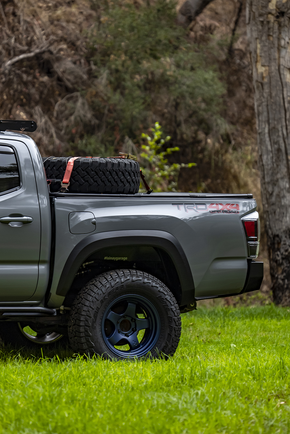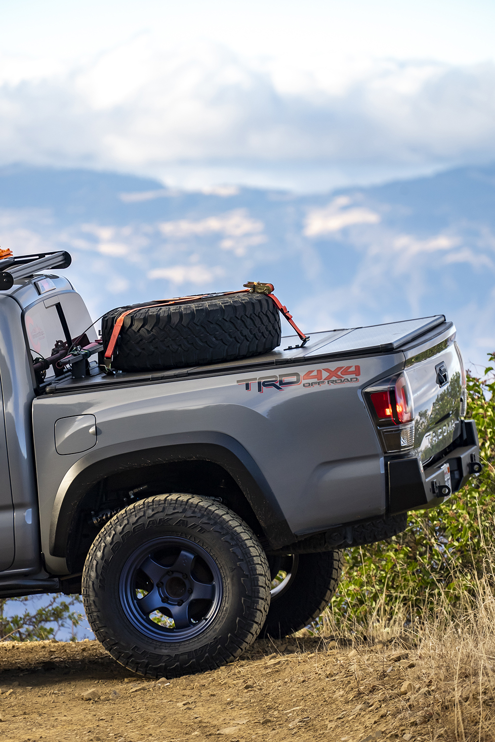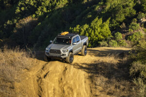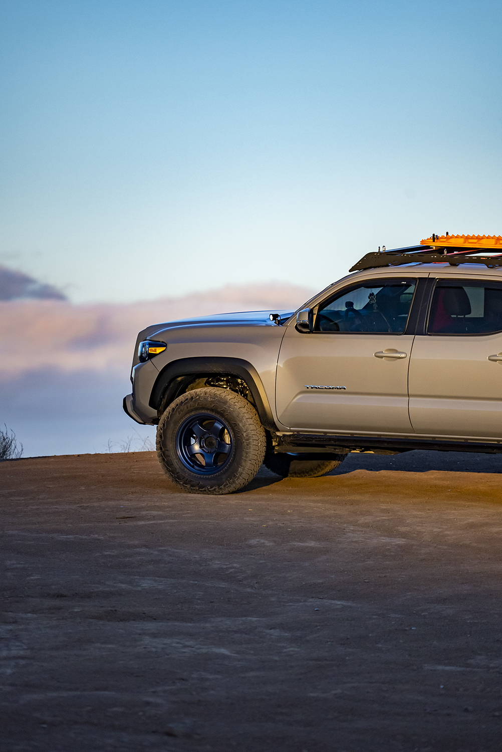This 2020 Cement Grey Toyota Tacoma TRD 4×4 Off Road features a Prinsu roof rack, Fox Performance Elite 2.5 suspension, and Baja Designs lighting. Tires shown in photos are 33″ 285/70-17 Falken Wildpeak A/T and wheels are Circuit Offroad Hayford 17×8.5 6×139.7 et-10mm in Matte Bronze.