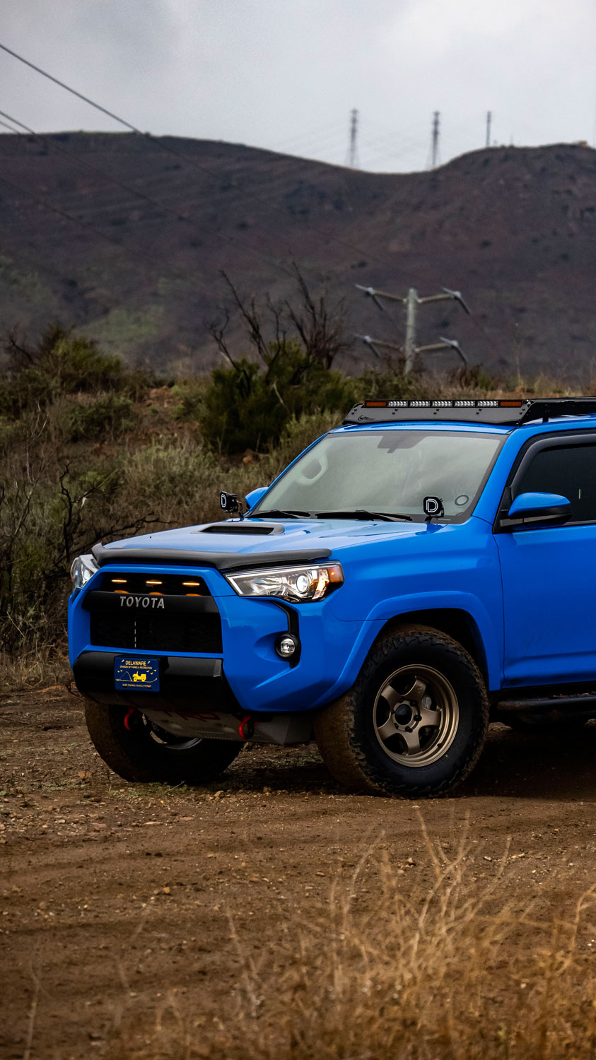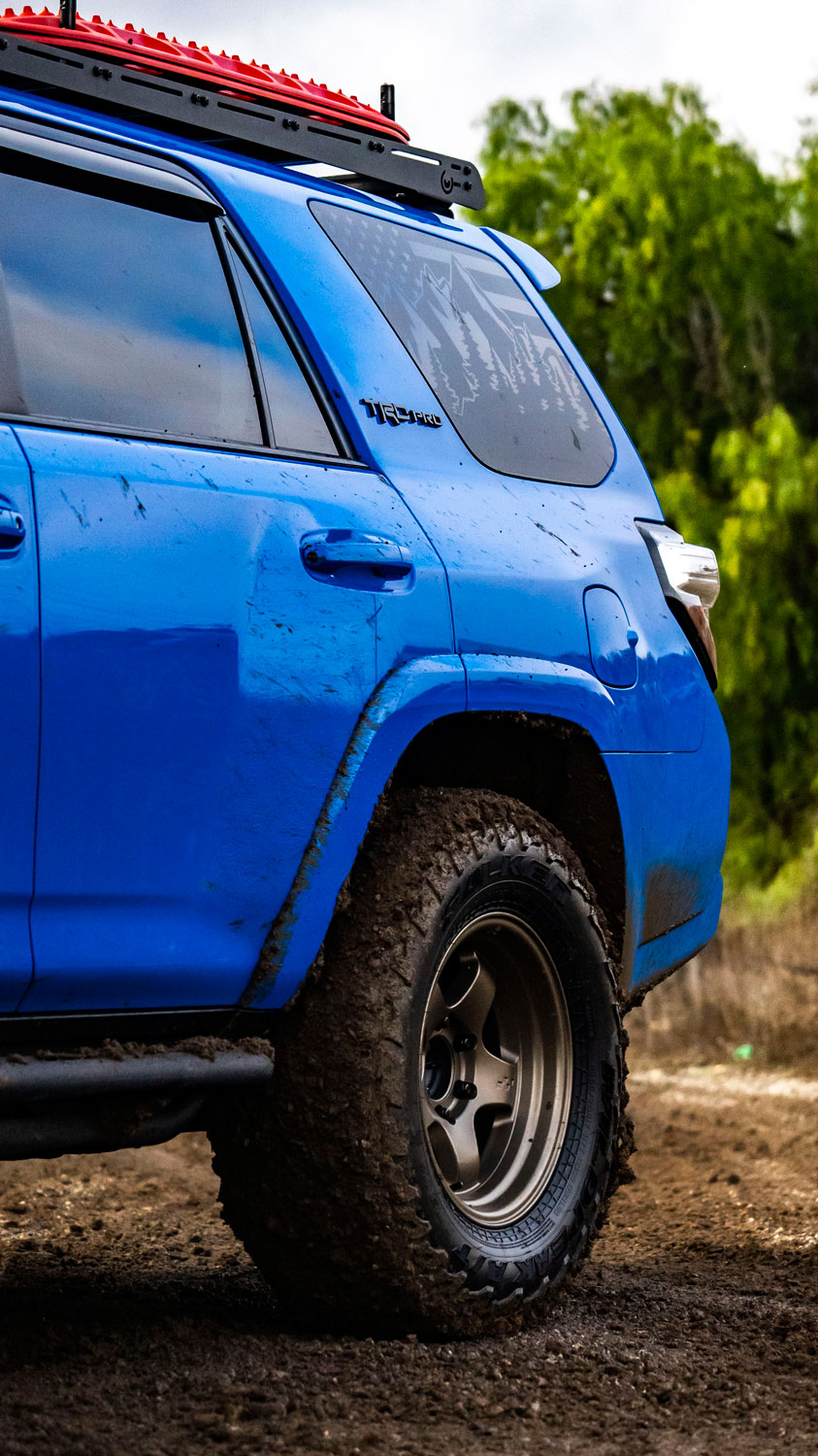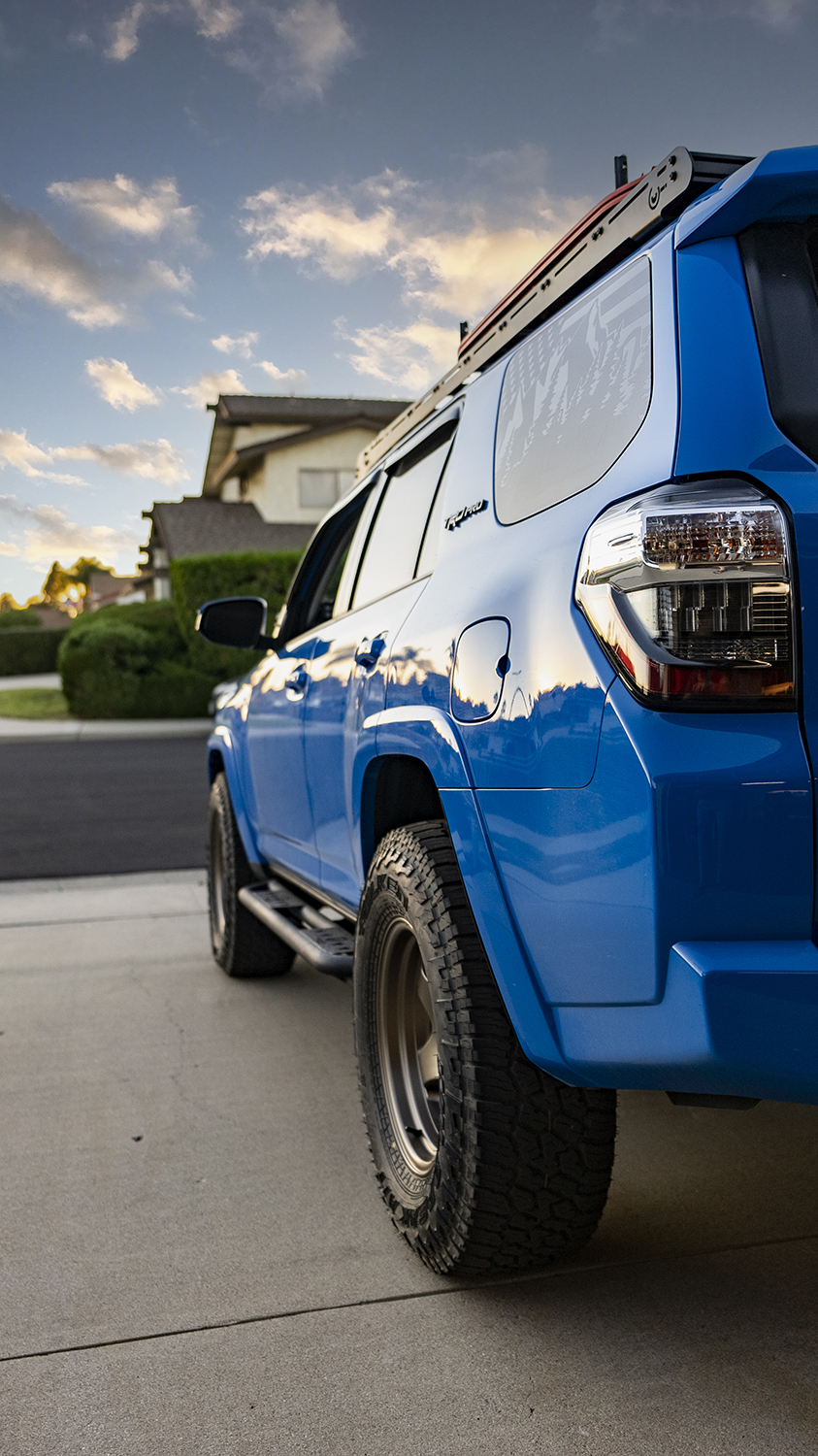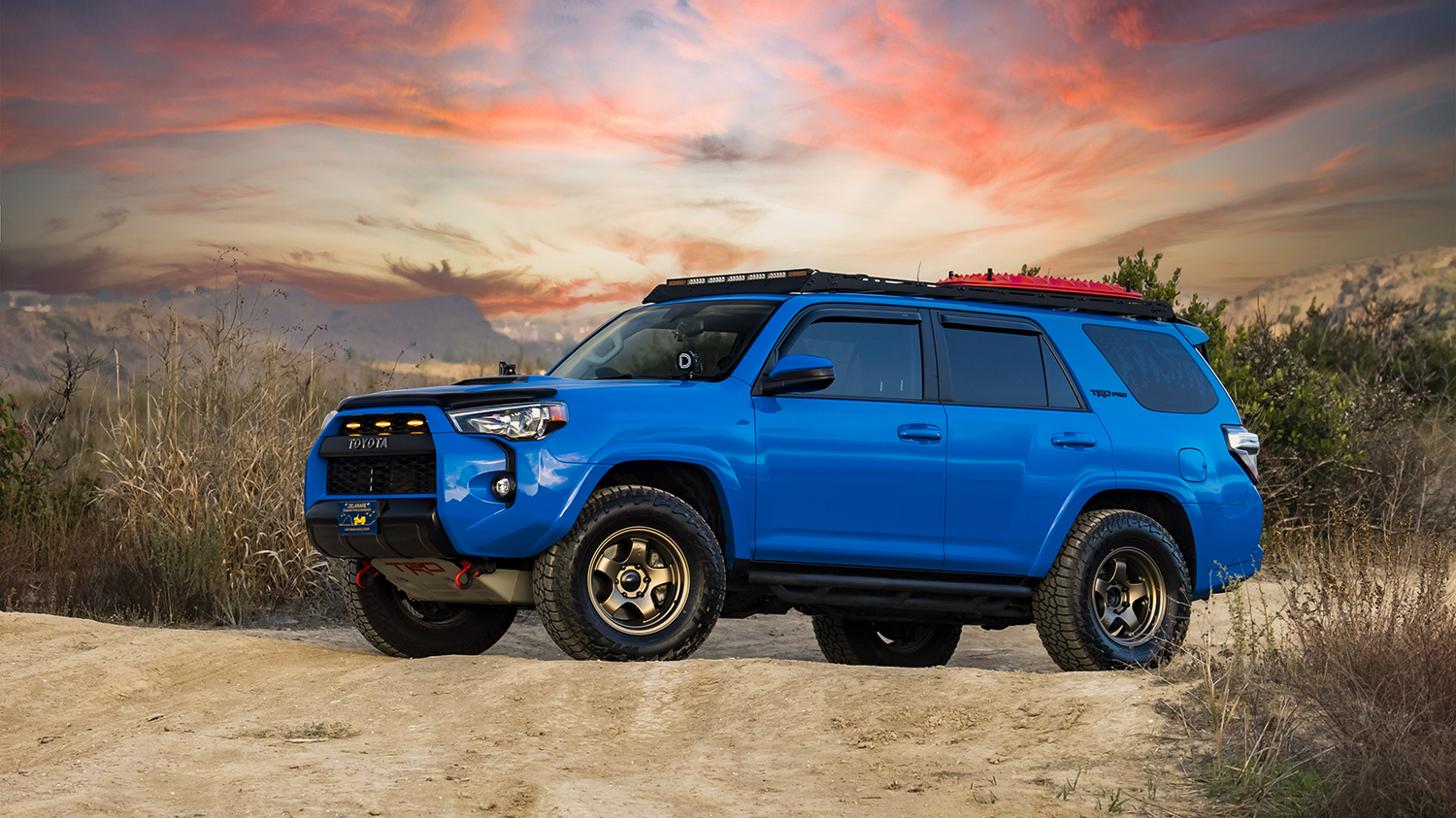This 2019 Toyota 4Runner TRD Pro features a Prinsu roof rack, SSO sliders, Gobi ladder, TRD Pro suspension, and Diode Dynamics LED Lighting. Tires shown in photos are 33″ 285/70-17 Falken Wildpeak A/T and the wheels are Circuit Offroad Hayford 17×8.5 6×139.7 et-10mm in Matte Bronze.