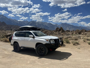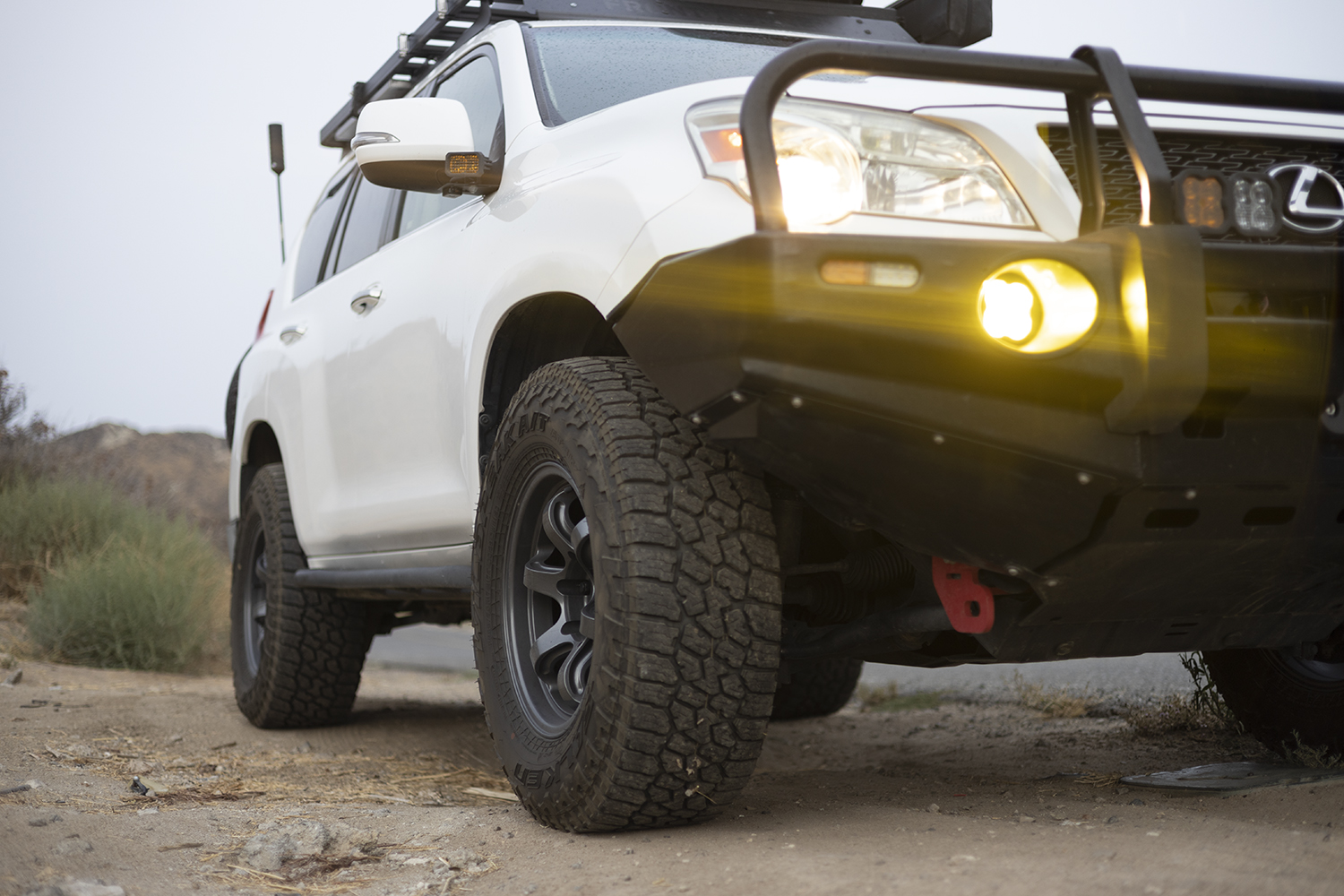 This 2011 Lexus GX460 features a Front Runner roof rack, Ironman front bumper, Kaymar rear bumper, White Knuckle sliders, Bilstein suspension, and Diode Dynamics lighting. Tires shown in photos are 33″ 285/70-17 Falken Wildpeak A/T and wheels are Circuit Offroad Windom 17×8.5 6×139.7 et-10mm in Gloss Gun Metal.